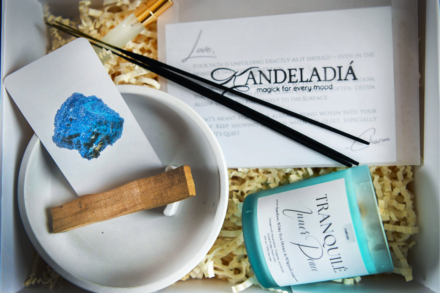 Explore CandlesSignature blends infused with crystals and intention. Light a moment of peace, love, or protection.